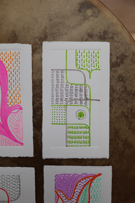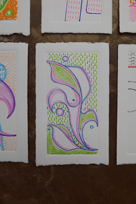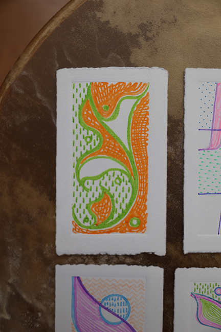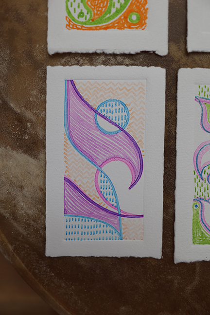 During the residency, residency and workshop manager Sam Havens showed me how to use a miniature printmaking press and classic washable Crayola markers to pump out dozens of little studies, where I explored the fusion of my Tlingit formline design training, weaving background, and floral beadwork motifs. These prints are informing my current and upcoming larger-scale 2D, woven, and appliqué work.