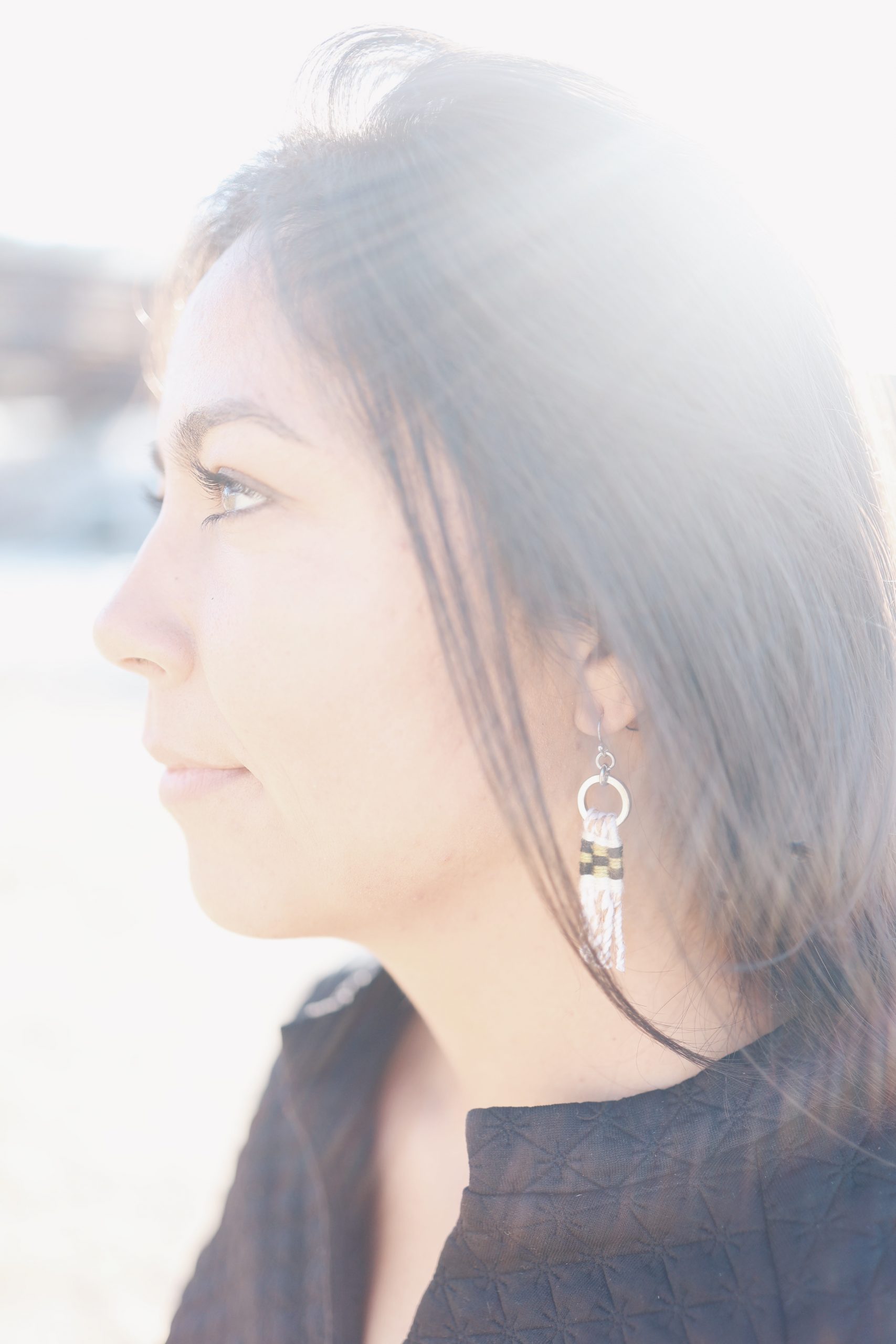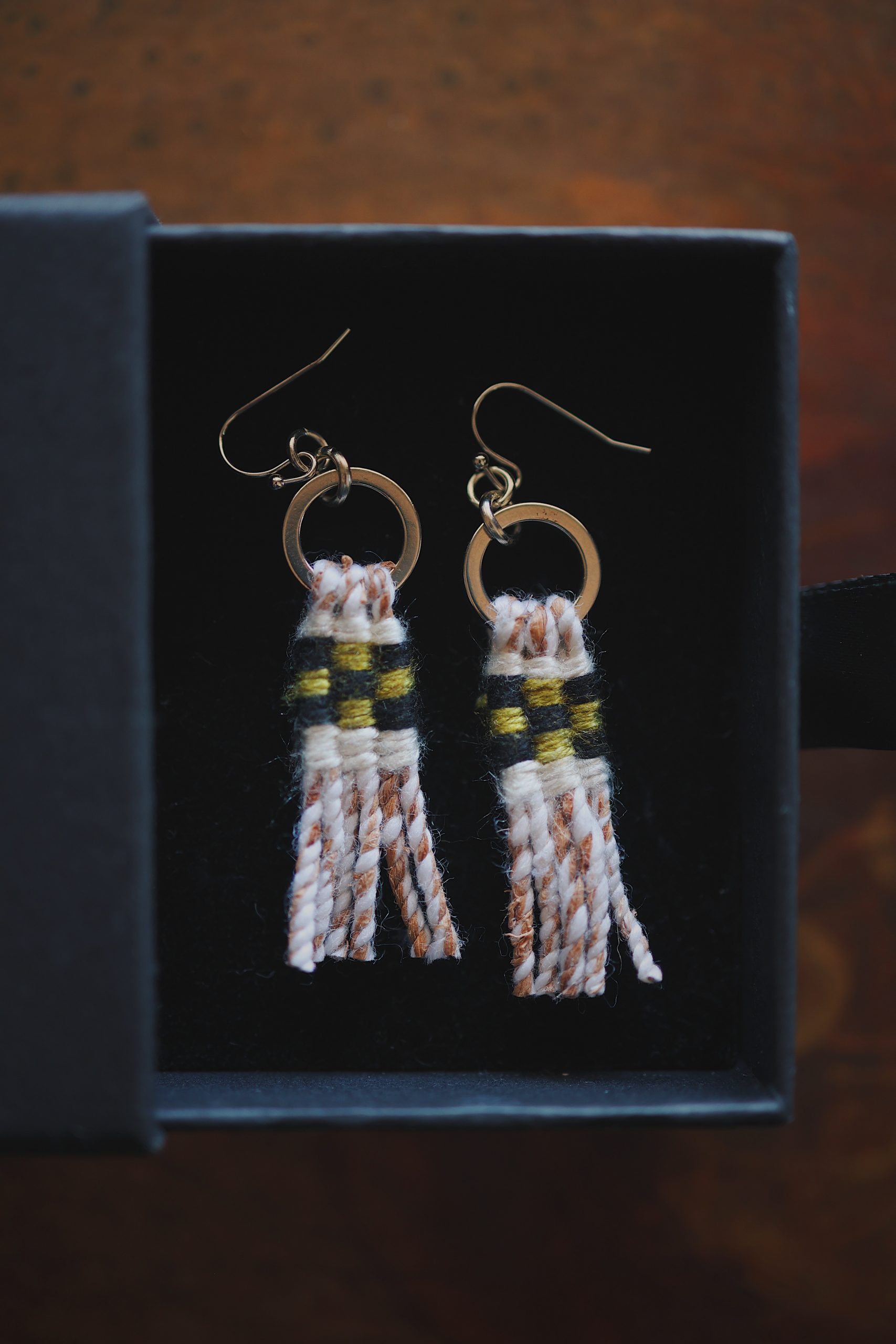 Woven to evoke ancestral strength in the wearer. These petite column earrings offer little reminders of intention for the one they adorn. Six warp ends are twined together on chrome hoops with merino/silk weft.