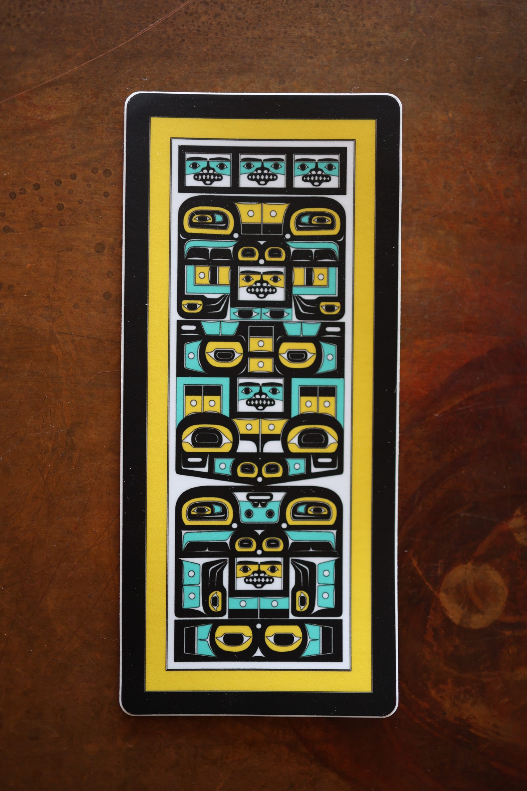 [ The House of Sáanáxhéit in Dreamland ] is a woven Chilkat totem pole that calls forth ancestral memory, ceremonial labor, and dream-carried knowledge. Its name references a Tlingit story in which art emerges from the depths of another world, brought back by a woman whose vision forever alters the human realm. This piece honors the unseen but essential work—often carried by women—that prepares the ground for ceremony, continuity, and transformation.