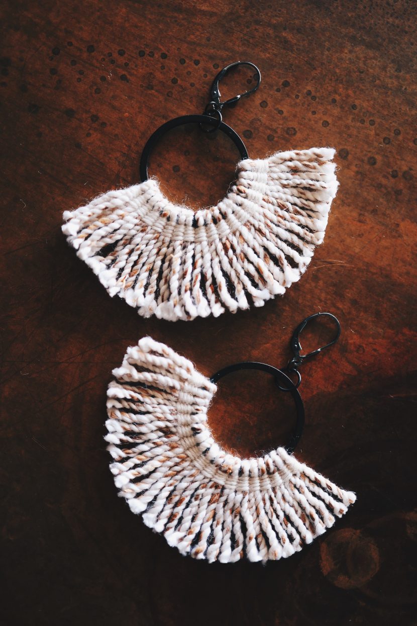 Woven to evoke ancestral rebellion in the wearer. A simple Ravenstail pattern twined with merino/silk-blend weft follows the edge of 1.2" matte black rings upon thigh-spun merino warp ends. Over time the warp ends will begin to fray, leaving the earrings ...