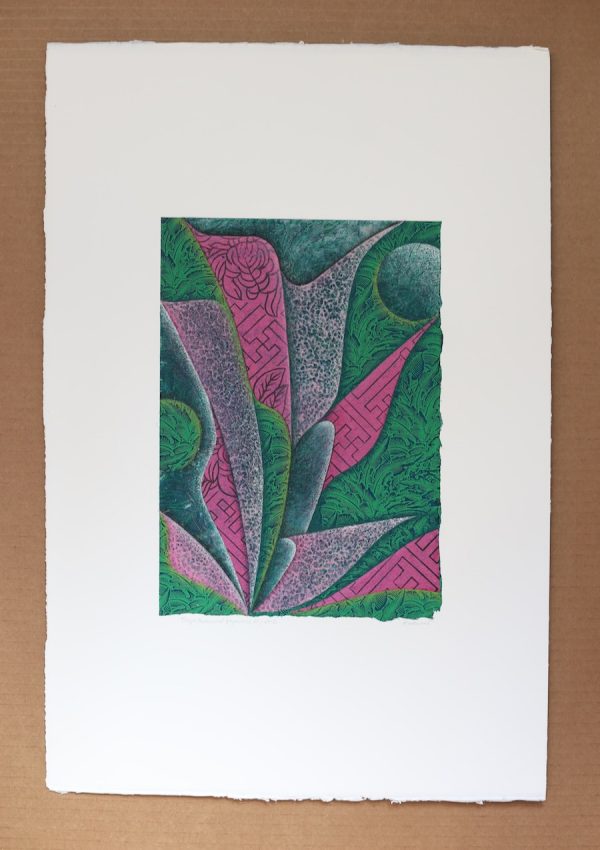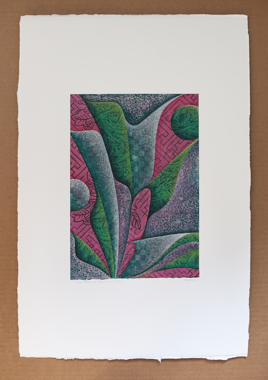 These four sheets of paper were gathered over many years. My mother selected the light pink Japanese paper in 2000 to embellish her own collages. The hot pink paper arrived shortly after and has remained part of my mother’s—and now my inherited—collage materials for over twenty years. Last year, during a shopping trip to The Artisian in Santa Fe, I chose the sheer white checkered paper (which becomes nearly invisible in these collages) and the green leaf paper. Simply holding these four papers made me feel very rich—in materiality, in lineage, in inspiration, in responsibility, in love.
